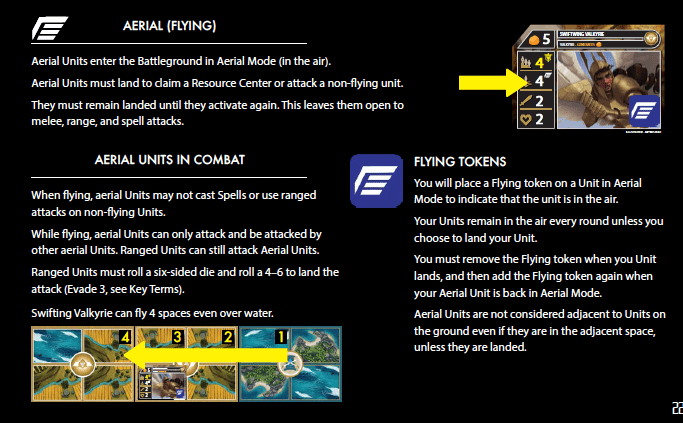 Flying units provide a lot of strategic advantages, but perhaps none is more helpful than their movement advantages…Aerial units can move over water spaces and also over other units without having to stop their movement, or without having to end their activation (they cannot end their activation on a space that another unit is currently occupying, however, and diagonal movement restrictions still apply).. This extra level of flexibility makes hard to reach enemy units much more reachable. Aerial units also tend to have above average movement, making them able to spread the Battleground and hunt down Captains and back-line units near the opposing basecamp.