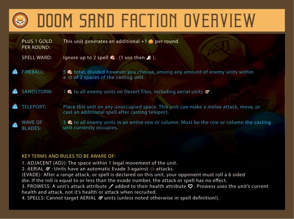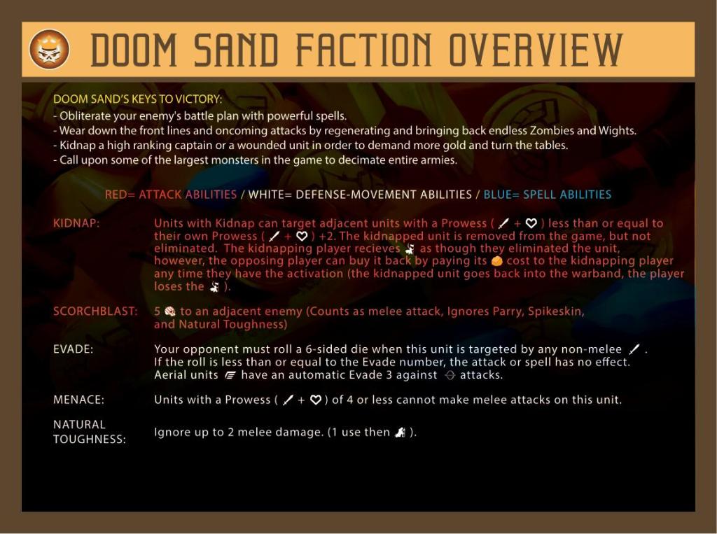 The ability “KIDNAP” is found on the Faction Overview, because other non-elite Doom Sand units have the KIDNAP ability as well. However, DOMINION is not found on non-elite Doom Sand units, so it is on the ELITE overview card.