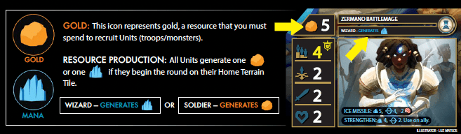 GOLD and MANA are the 2 Resources in Factions: Battlegrounds. Gold is spent to pay for units, and Mana is spent to pay for spells.