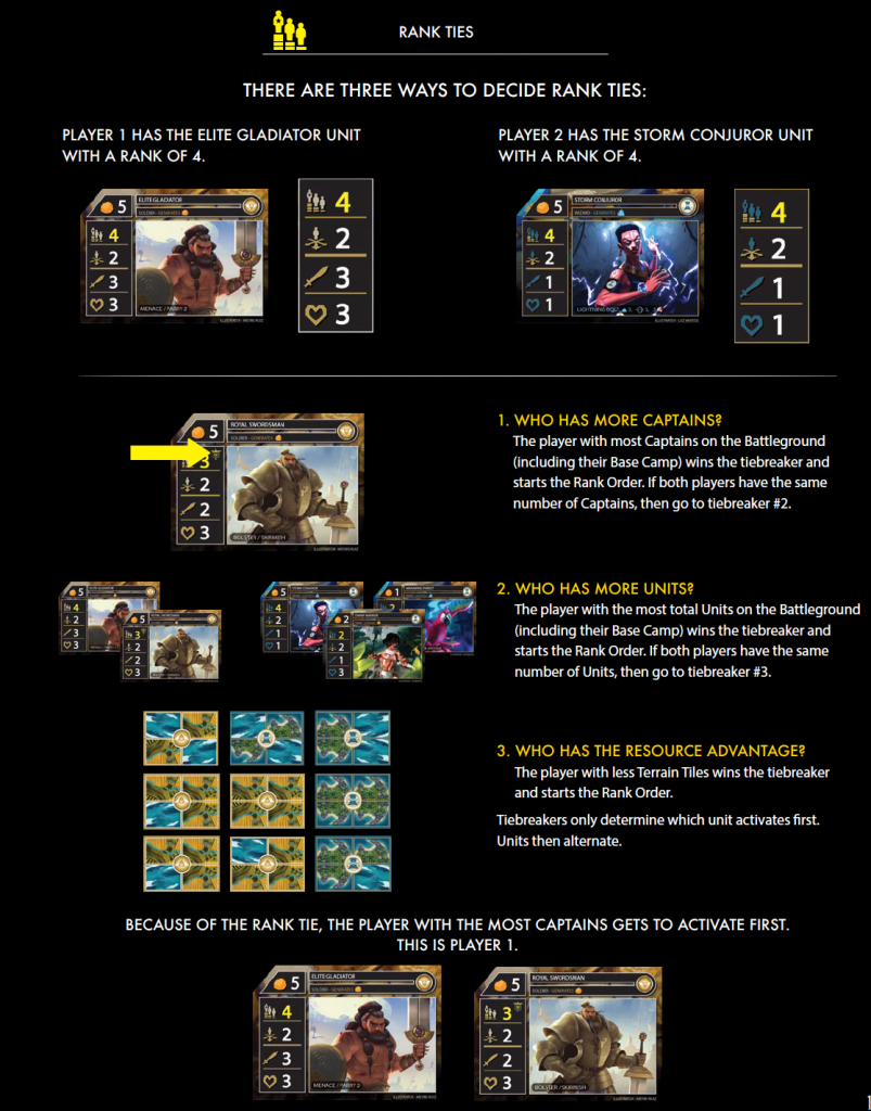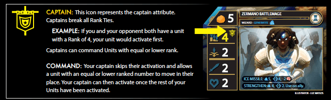 Units move, attack, and make their impact when it is their time to activate. The Rank attribute determines the activation order of the units on the Battleground. Sometimes, there is a Rank tie, meaning 2 or more units have the same Rank attribute skill number. Knowing how to win tie-breakers naturally (With Captains!) is a skill that can really help your chances at victory!