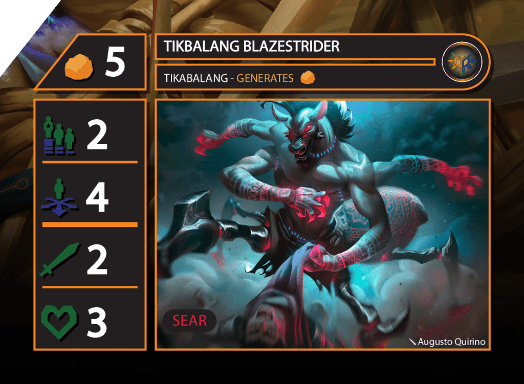 Kennedy felt he could give a better showing with Ihalaban and since I have been tired of losing to Kragg lately I decided to try them out myself! I went with the Goblins/Razortusk starting warband that is low on health, but great for snaring resource centers and seems to be a popular and effective vangaurd. Kennedy had a good answer though, using the explosive Tikbalang Blazestrider again to speed over to the corner gold mine on the side of the board, and use Sear to incinerate a goblin along the way. The gold mine was in a spot that it would take a lot of effort/risk to claim, and I had a stable gold influx coming in, so instead I proceeded with my plan to outmuscle Kennedy on the frontlines.