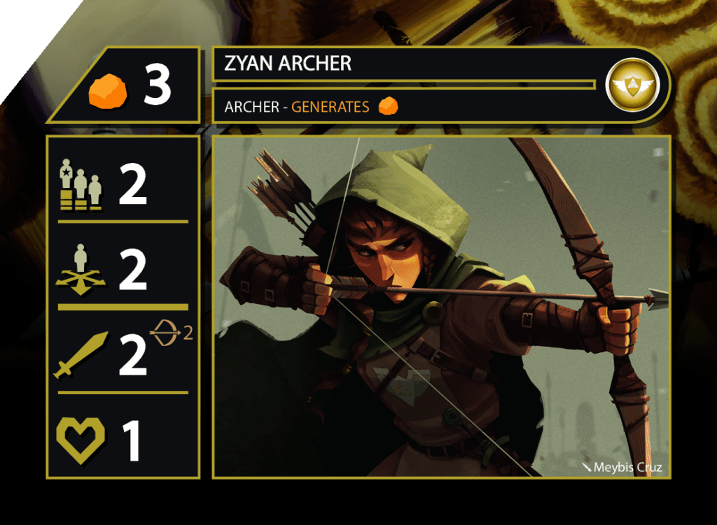 Ranged units are a bit of an afterthought for Zyan as their strategies gravitate towards either Aerial units or defensive melee units. Zyan Archer is the cheaper option for Zyan, and can serve as a nice compliment to either central strategy. The 2 damage, on the surface, does not seem impactful, but Zyan does not have a lot of offensive focused units, and certainly not a lot that are readily affordable. Because Zyan has a lot of captains, the Zyan Archer can be commanded to get an attack in prior to the melee units charging across the battleground. The rest of the Archer’s stats are underwhelming, especially their 1 defense. The Zyan Archer very rarely is going to survive very long, but that is ok provided they can activate and wound an enemy or 2.