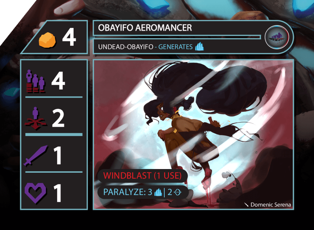 If the tactics and flow of the battle don’t align with the Obayifo’s Windblast and Paralyze, she is going to have a hard time making an impact- and for 4 gold, while not overly expensive, you will need something that can do better than 1 health with no defensive skills. The Aeromancer’s rank is helpful, and maybe Paralyze or Windblast can be used, but if there are multiple units in the middle tiles or within reach of your basecamp, she is just not worth the easy 4 enemy VPs.