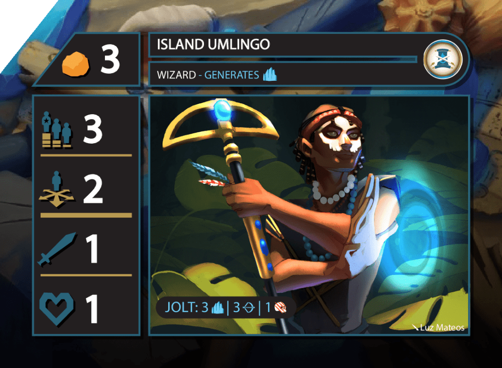 If Jolt becomes a lower priority, then so too does Island Umlingo, because it is not going to do much else. However, if there is either a drastic need or an abundance of mana, Island Umlingo still serves a valued purpose. Since it generates mana, it can serve as a resource gatherer as mana is crucial to Zermano’s success. If there is an extra 3 mana available and a low health enemy unit, Island Umlingo can zap it, and if Zermano is strapped for gold but needs to take out a severely wounded threat, the Island Umlingo could get the task done cheaply.